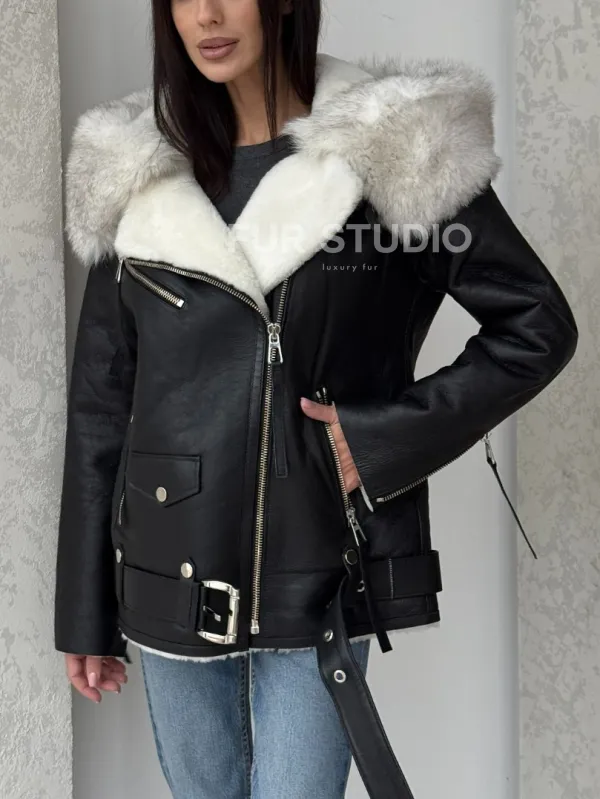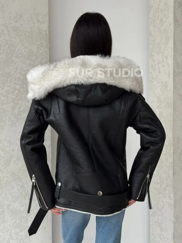 Черная куртка дубленка с капюшоном 100256