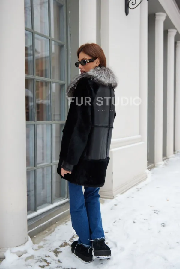 Дубленка черная с меховым воротником 100763