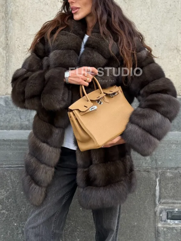 Оптимальная длина удобна в носке, не сковывает движение. Воротник стойка позаботится о шее в непогоду и подчеркнет ее изящество. Широкие рукава выделят тонкие кисти. Прямой крой удлиняет силуэт и зрительно скрывает недостатки фигуры. Купить шубу из меха соболя станет отличным вложением для женщин, которые не привыкли себе в чем-то отказывать.